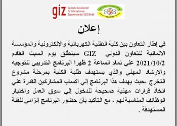 في إطار التعاون بين كلية التقنية الكهربائية والالكترونية والمؤسسة الألمانية للتعاون الدولي GIZ سينطلق يوم السبت 2/10/2021 البرنامج التدريبي للتوجيه...